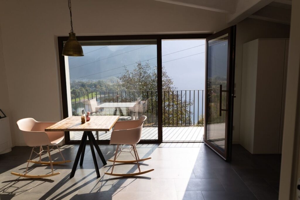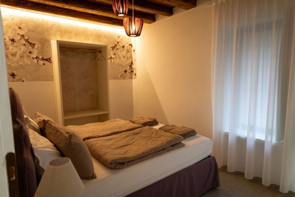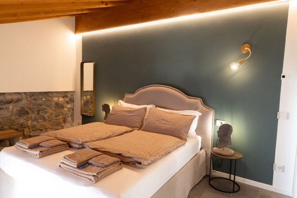 Questa home suite è un open space caratterizzato da travi a vista e dalla luce naturale che entra dall’ingresso con ampia finestra a tutta parete. Troverete una piccola zona pranzo con angolo cottura e vista lago. La zona notte è composta da un letto matrimoniale con testata di legno originale recuperato e un capiente armadio. Il bagno è dotato di una spaziosa doccia a pioggia.