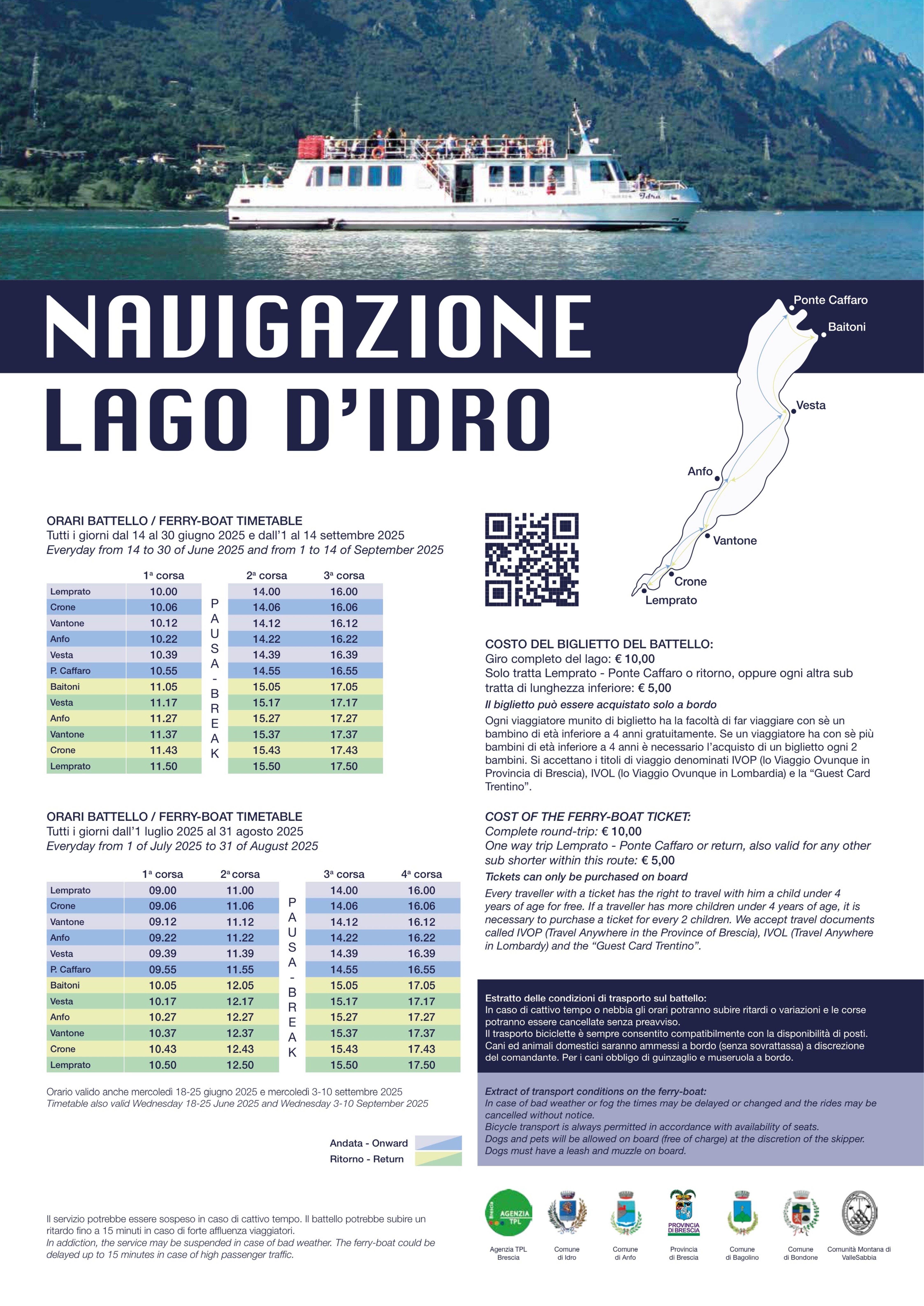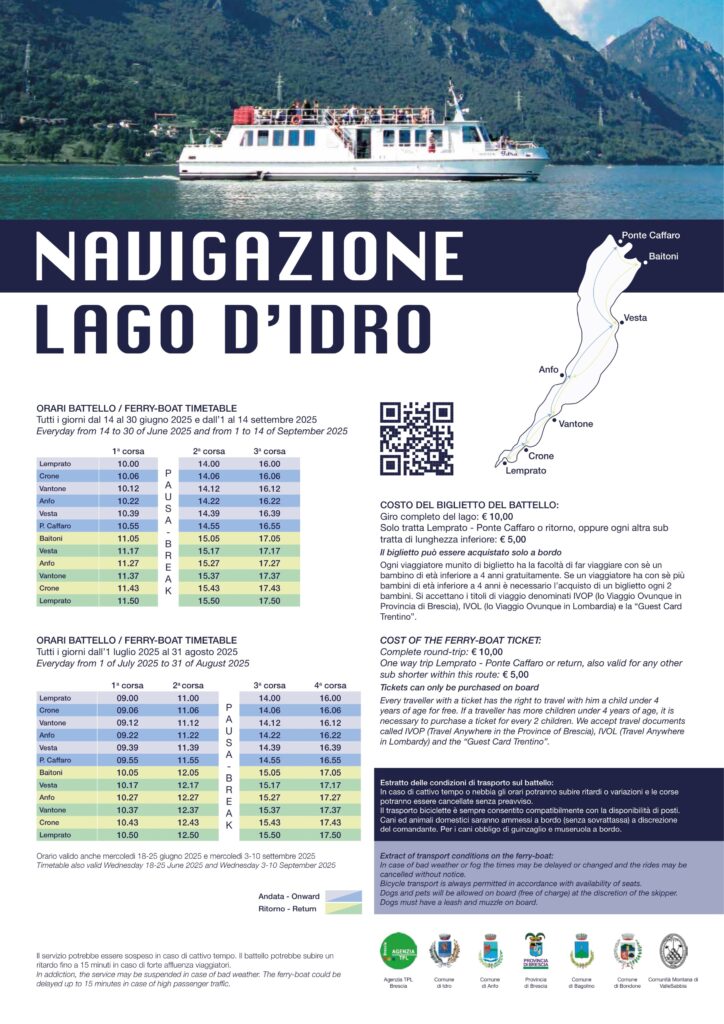 De tocht, die ongeveer twee uur duurt, maakt het mogelijk de omgeving van het Idromeer te observeren en te bezoeken: met vertrek en aankomst in Lemprato, maakt Idra ook stops in Crone, Vantone, Anfo, Vesta, Baitoni en Ponte Caffaro.